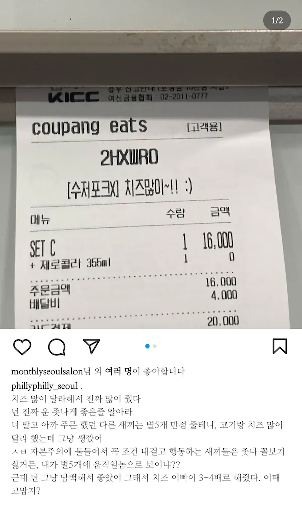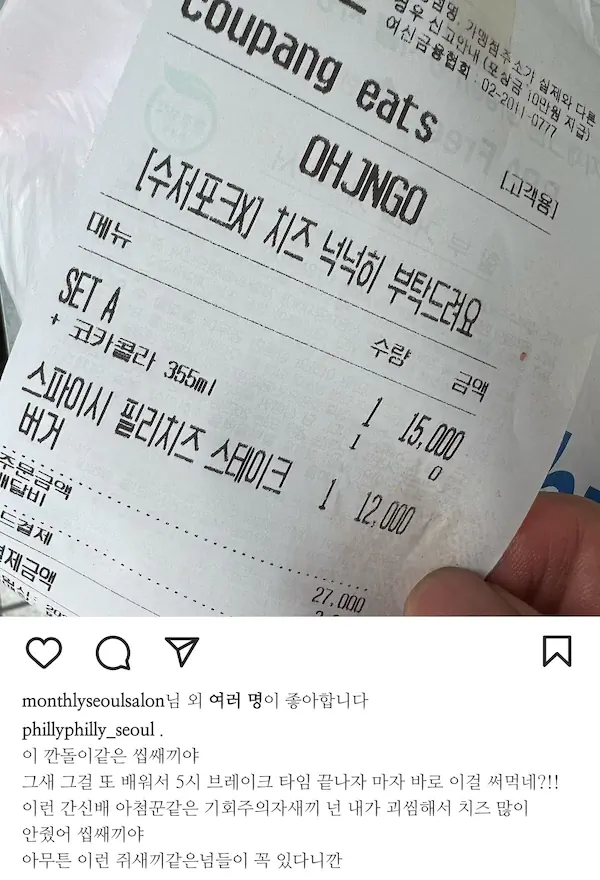필리필리 서울, 쿠팡이츠 배달한 손님에게 인스타 게시물로 욕설글을 작성