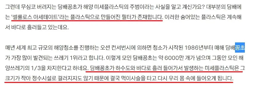 담배의 경우엔 하천이나 바다로 들어갈 때 앞서 말 되어있듯이 환경문제가 생김
