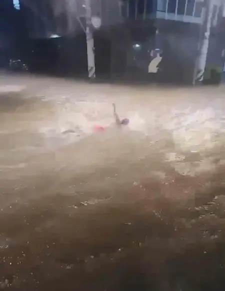 서울 물난리 와중에 물이 넘치는 신림동 거리에서 수영하는 남성