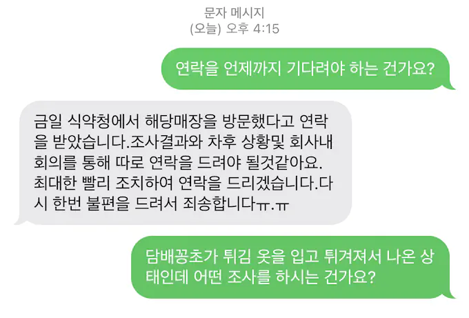 그리고 우리는 예정대로 식약처에 넘길 거고 사과 한 마디 없으시고 이 태도에 화가 나서 본사에도 전화해 알릴 거다 하니
