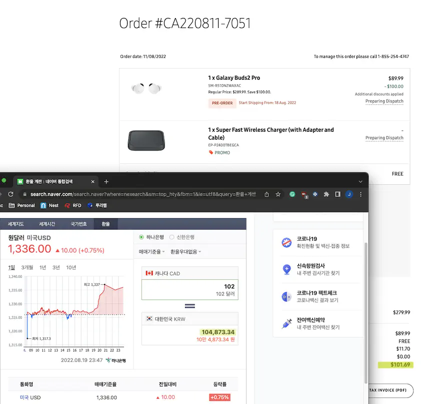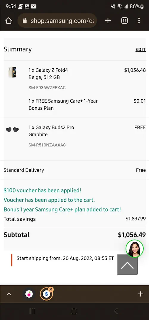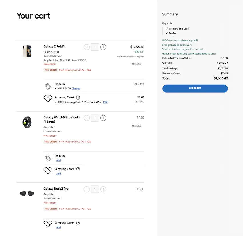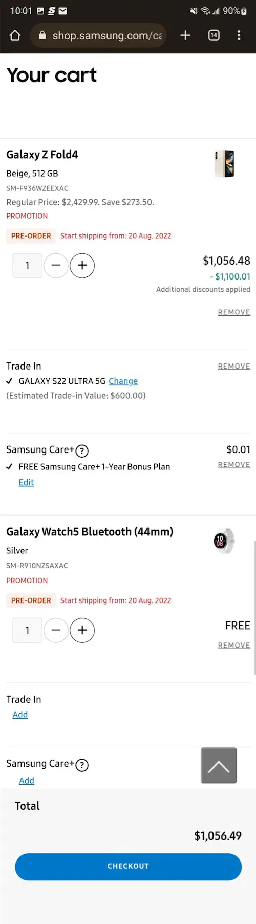 지금 워치5는 다 팔렸다고 카트에는 들어가지는데 체크아웃할때는 없어집니다. 프로모코드 $100불할인에 버즈2 프로 공짜 프로모 코드도 넣었고요. 트레이드인 지금 쓰고 있는 S22울트라 512gb넣었더니 $400불 크레딧에 기기값 $600불 쳐주더라구요. 잘 찾아보심 딜은 다 있습니다.