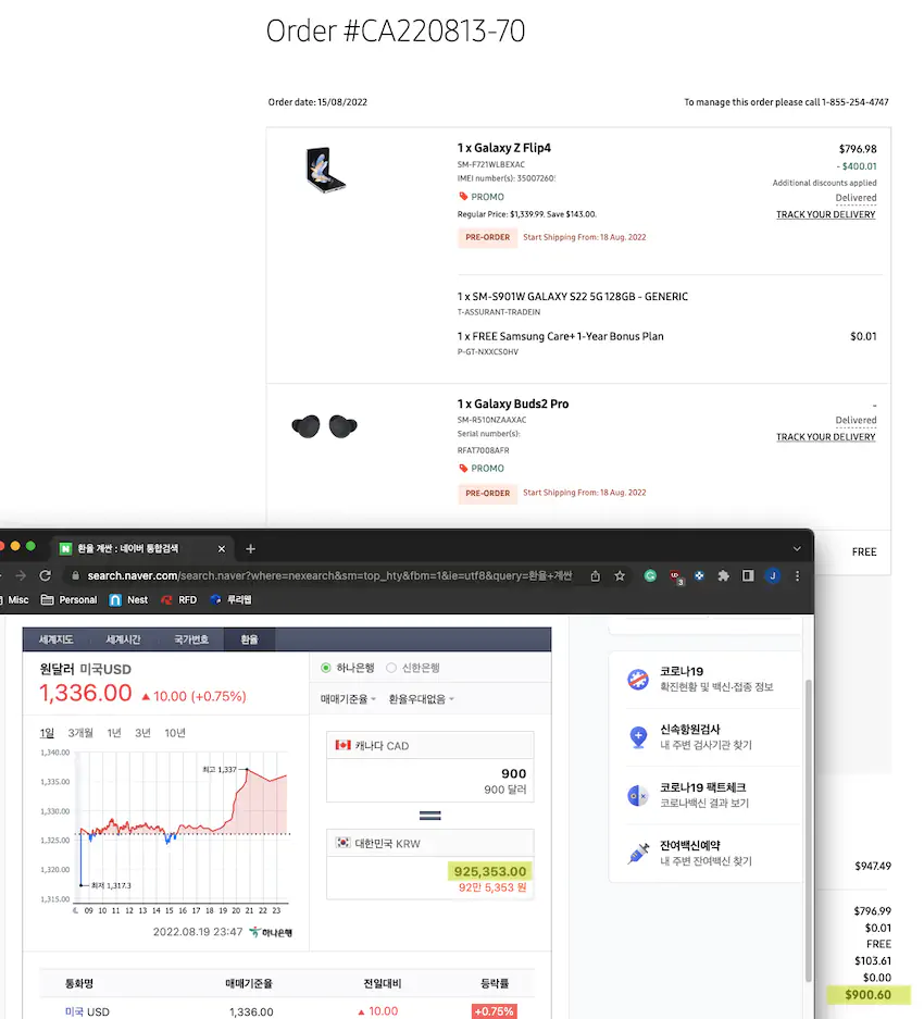 아 마지막으로 트레이드인에 그냥 S8 폰 IMEI만 넣어도 같은 가격입니다. 그런데 왜 S22를 넣었냐고 물으신다면 캐나다와 미국의 가장큰 차이점은 트레이드인 하는 폰을 안보내도 그만이라는겁니다.