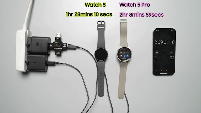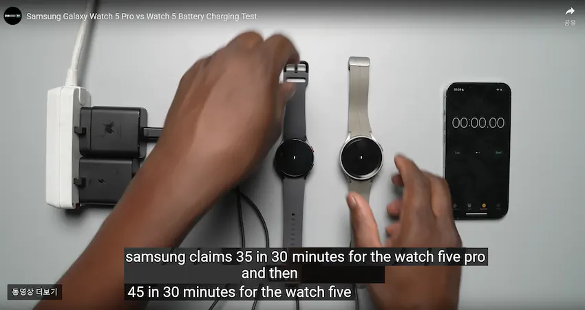 100% 충전하려면 워치5는 1시간 28분, 프로는 2시간 9분이 걸림.