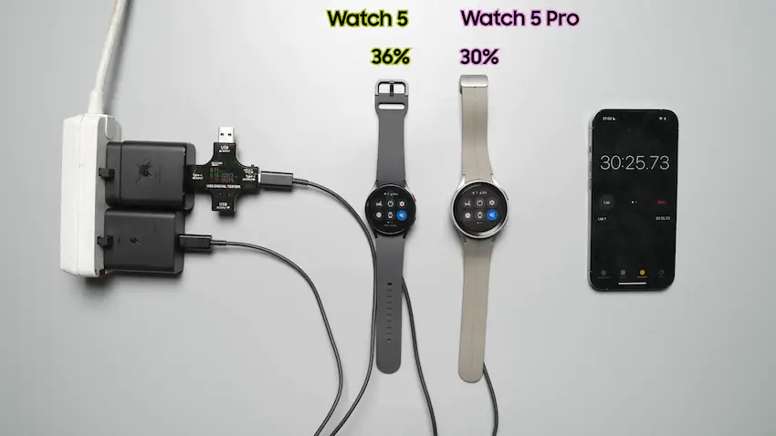 30분 동안, 워치5는 36%, 워치5 프로는 30% 밖에 충전이 안됨.