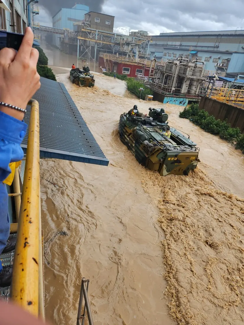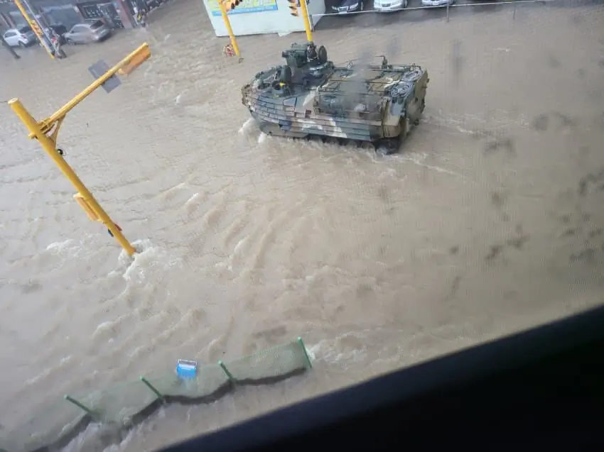 고무보트 대신 해병대 수륙양용 장갑차 등장 (장갑차 위에 주황색옷은 소방관임)