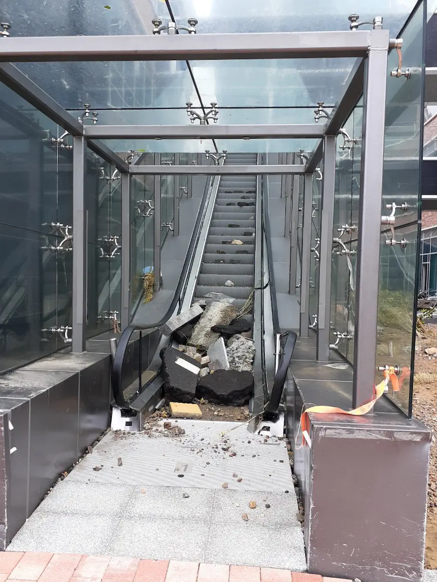 아스콘 덧씌우기다 주변 조경 새로 하면서 아스콘으로 포장면 새로 했겠지 콘크리트 갈아낸 흔적이 있네 그리고 접착 잘되라고 역청재 뿌린다. 아스콘이라 보수는 금방할 듯.