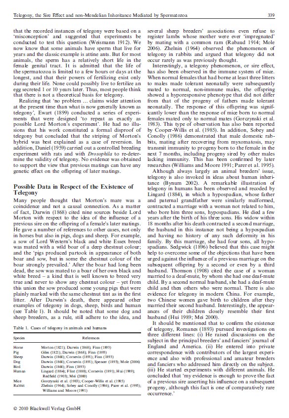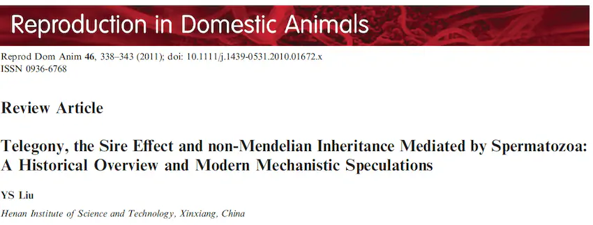 Telegony, 부계 효과 및 정자에 의해 매개되는 비-멘델적 유전: 역사적 개요와 현대적 기계론적 추측 (2011)