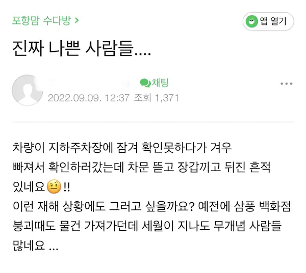 포항 태풍 힌남노 피해로 침수된 지하주차장 자동차에서 금품털어서 도둑질함. 인명사고난 주차장말고 다른곳이라고 함.