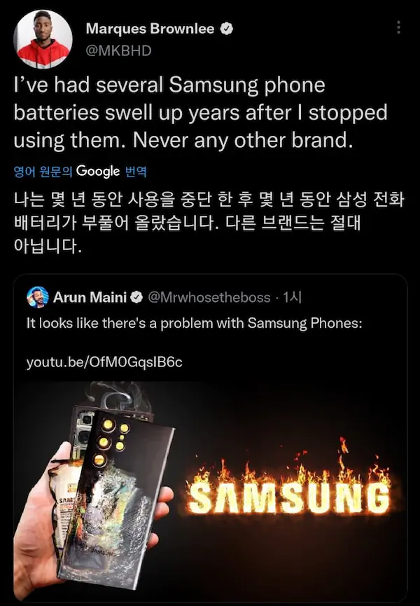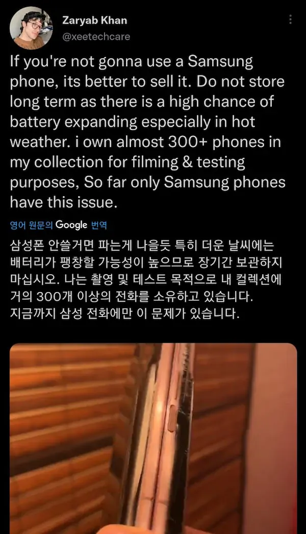 “한 번씩 확인해보면 배터리가 부풀어서 버려야 했던 폰들이 한 두개씩 있다. 그런데 그 폰들은 죄다 삼성 폰들이다.”
