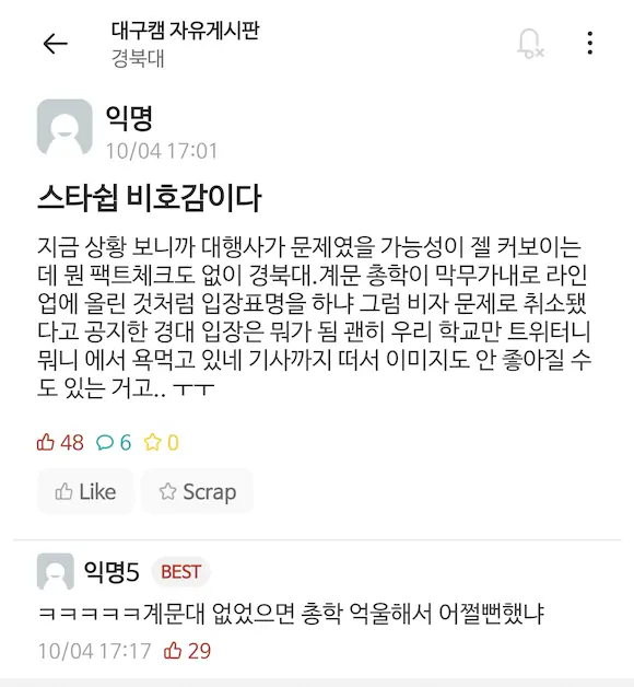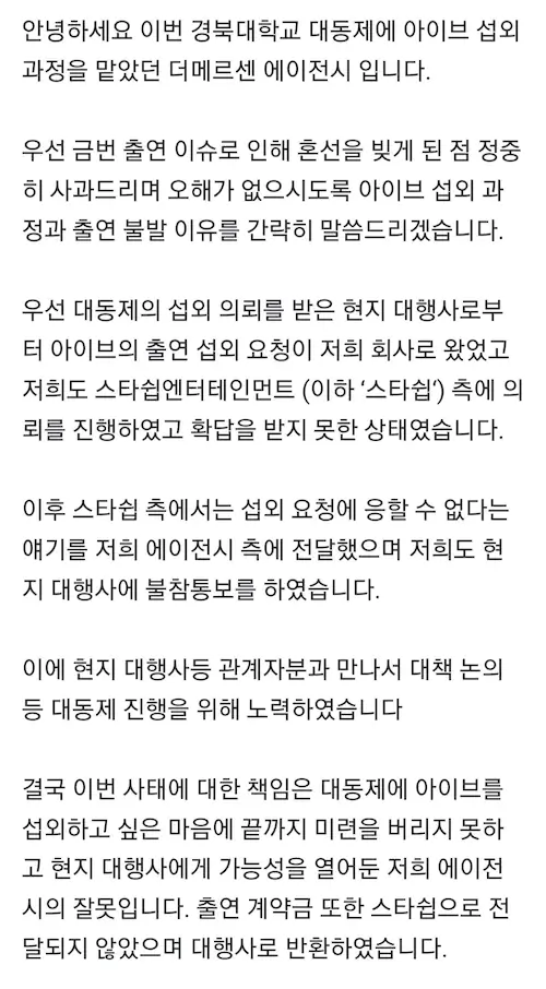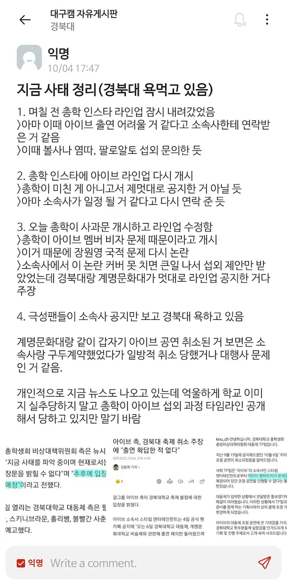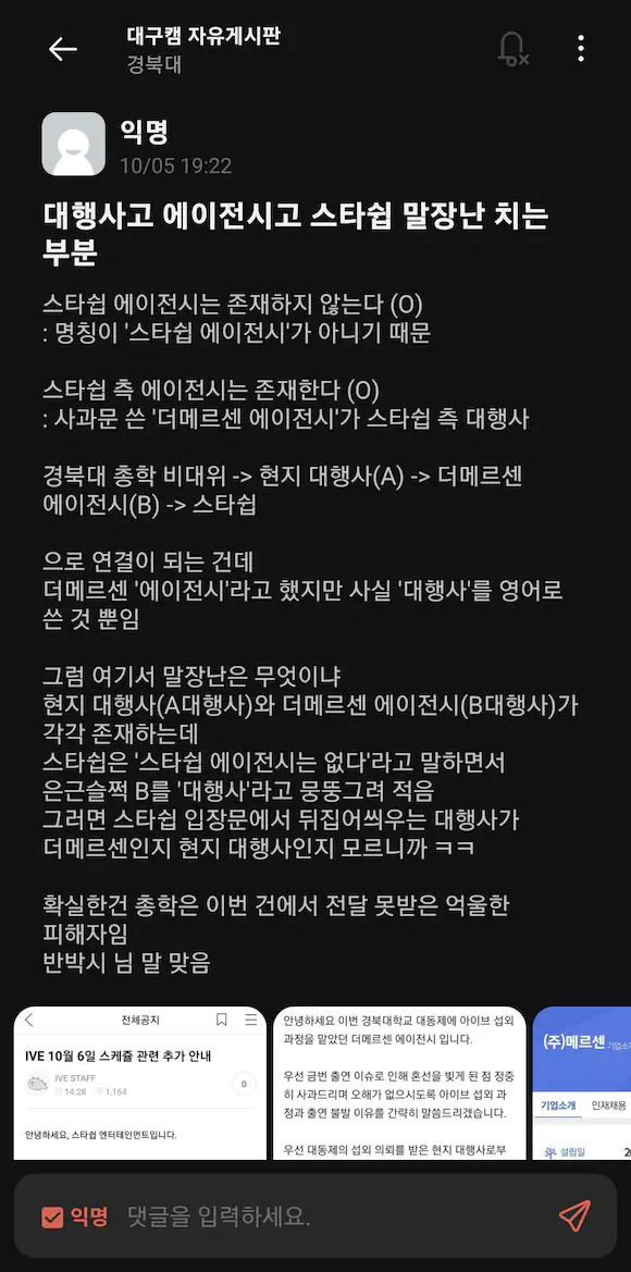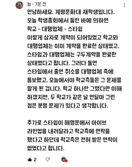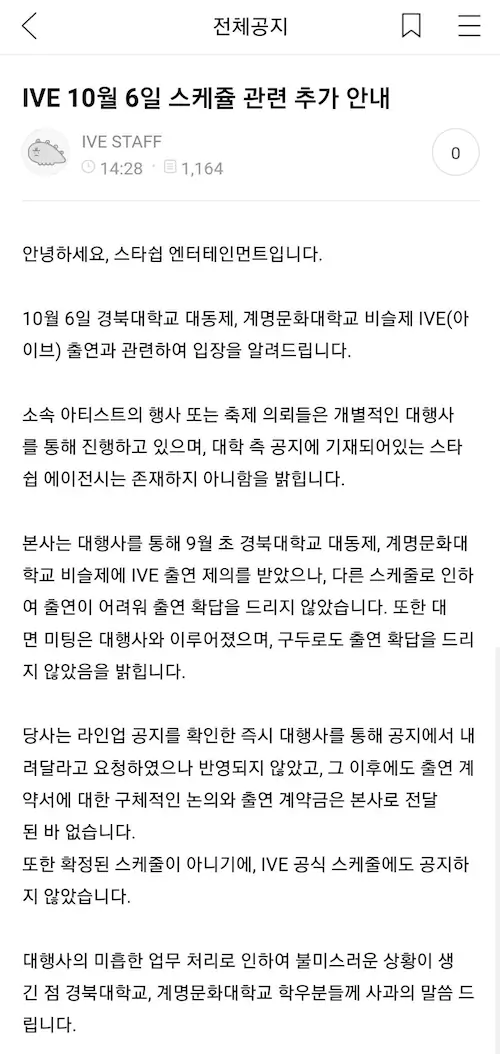 경북대 한 곳만 그랬으면 모를까 경북대와 같은 날 공연이 예정돼있던 계명문화대도 직전에 불참 공지를 올리고 부랴부랴 대타를 구하고 있는데 학교를 저격하는 글을 올린 스타쉽의 태도는 정말 이해가 되지않네요.