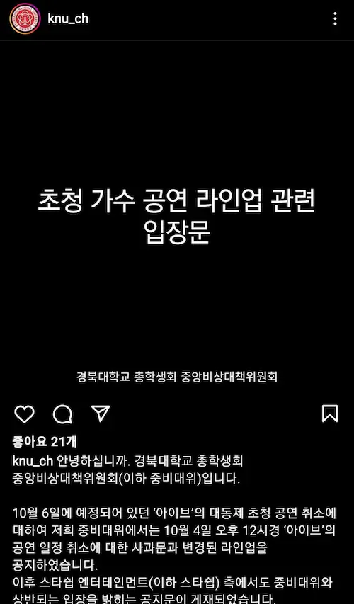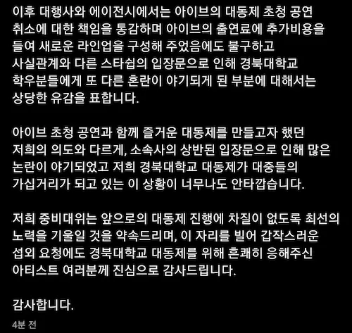 경북대 학생회 아이브 축제 취소 입장문