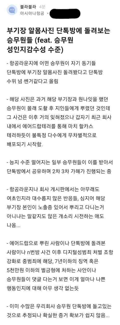 남성 부기장 알몸 사진 에어드랍으로 받고 단톡방에 올려서 돌려보는 아시아나 항공 승무원들