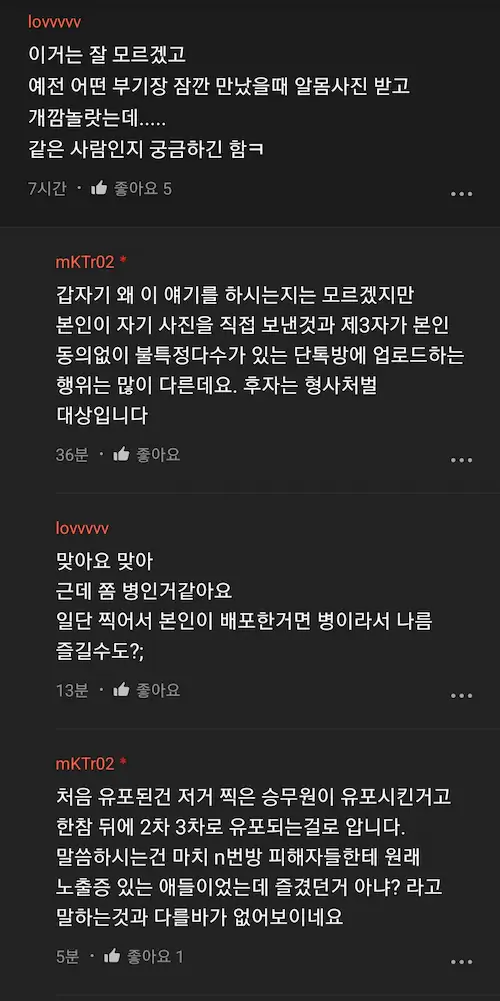 아니 나체사진을 직장, 모르는 사람들한테 계속 돌려버림? 와... ㅅㅂ 이거 단톡방에 있던 사람들 다 감옥 쳐넣어야 되는거 아님?