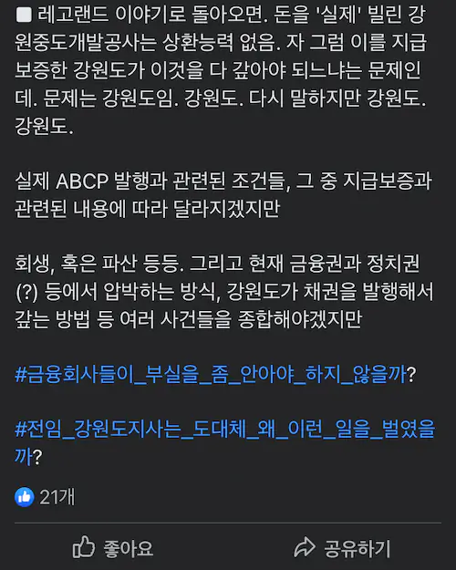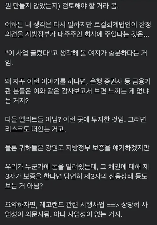 내생각과 비슷한데 잘정리했네. 자꾸 지자체 신용 이야기하는데 지자체가 보증서면 무조건 믿는다는 금융권도 엄밀히 말해 도덕적해이라고 봐야지. 현직 도지사가 정치적 목적으로 뒤엎었다고 하는데 마찬가지로 전임 도지사도 정치적 목적으로 앞뒤 안재고 보증선것 아님?? 도지사가 앞뒤 안재고 보증 섰으면 무조건 강원도민 세금으로 충당해야함??