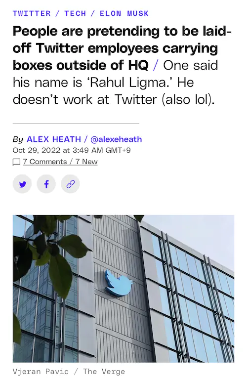 저 짤에 나온 Rahul Ligma 라는 사람은 실제 트위터 직원이 아니고 그냥 트위터에서 짤린 사람 "코스플레이" 를 할 뿐인데