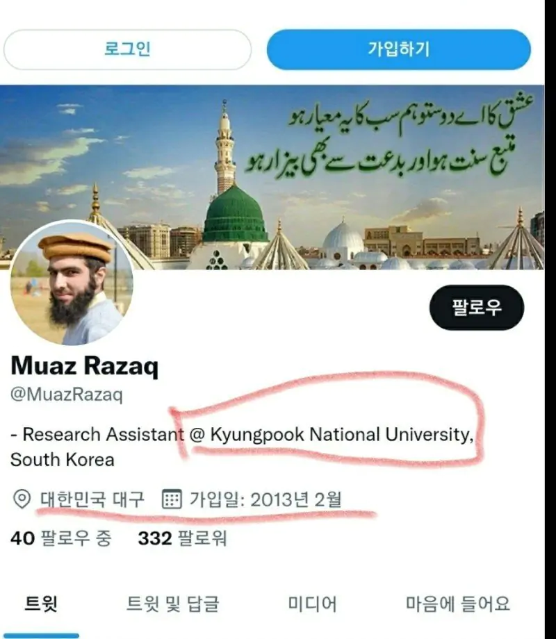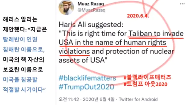 대구 이슬람 사원 건축 추진자 중 한 사람이면서, 각종 언론 인터뷰에 노출되어 이슬람 사원 건축을 옹호해 온 무아즈 라작(Muaz Razaq)씨가 지난해 그의 개인 트윗을 통해 친 탈레반 성향을 드러낸