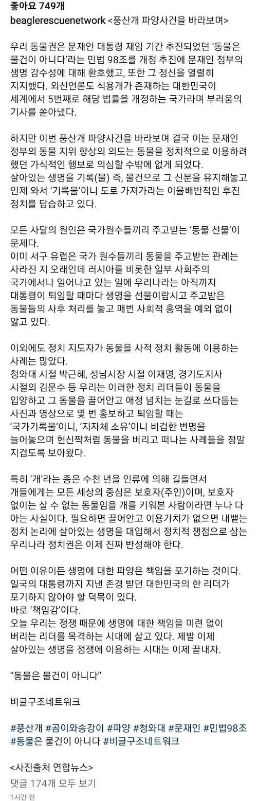 문재인 풍산개 파양 성명문