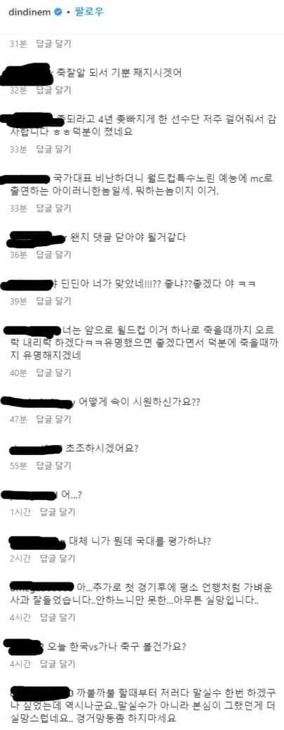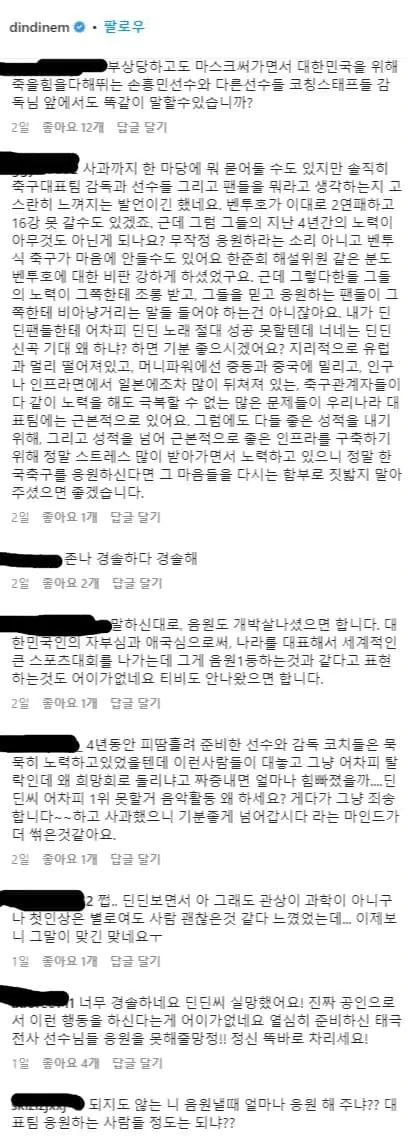 딘딘의 월드컵 발언에 화가난 팬의 댓글