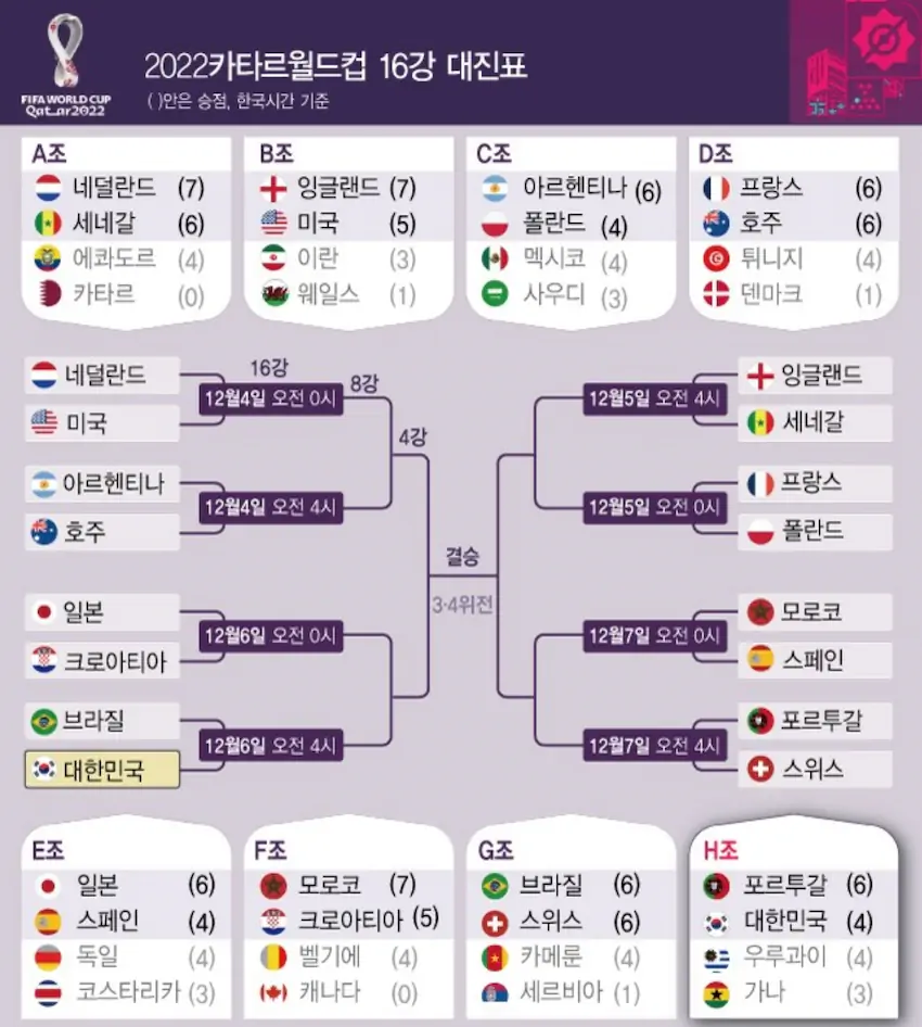 카타르 월드컵 16강 대진표