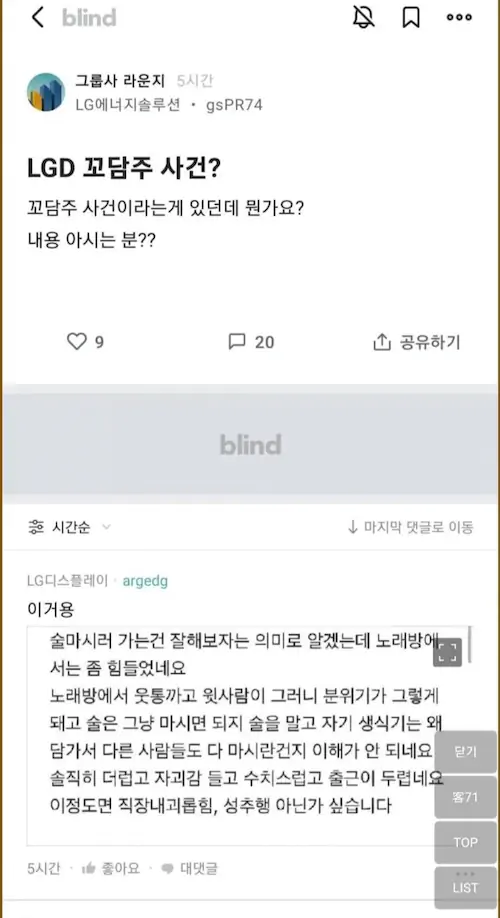 엘지는 왜 안망하나 싶을정도로 조직문화 퇴폐적임 ㅇㅇ 쌍팔년도랑 달라진거 없을듯