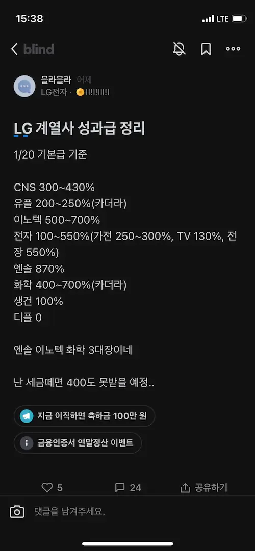 lg 계열사는 계약연봉의 1/20이 기본급이다. 1/12가 아냐 나머지는 전부다 성과급처리