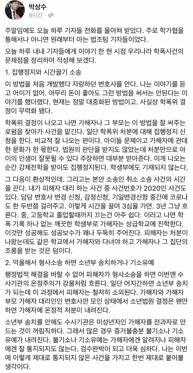 변호사가 이야기해주는 학폭 피해자들이 처벌을 피하는 방법들. 박상수 변호사 페이스북 글.