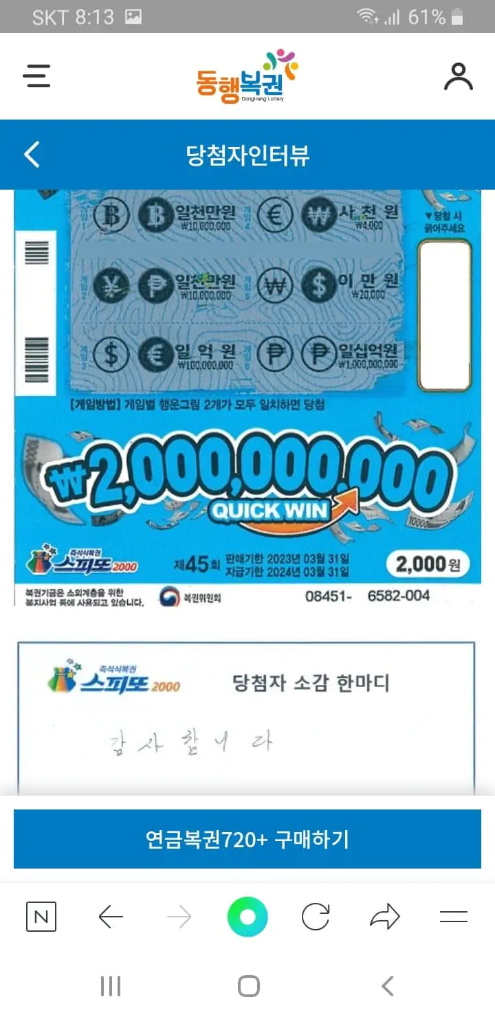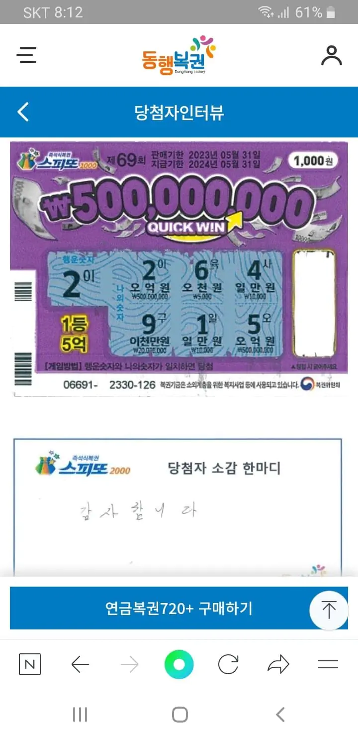 스피또 45회와 69회 당첨자 소감 싸인 사진까지 똑같다. 필체가 똑같은 정도가 아니라 그 소감을 찍은 사진 자체가 똑같다.