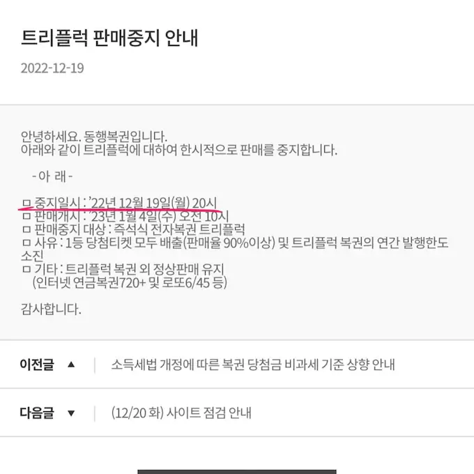인터넷 로또 당첨 329회 말이 안된다. 22.12.19 트리플럭 판매 중단 되었고 23년 오픈이였다.