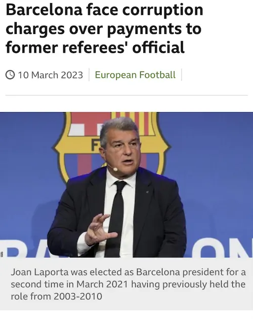 BBC 보도, FC바르셀로나 심판 뇌물 매수 혐의로 스페인 검찰에 기소.