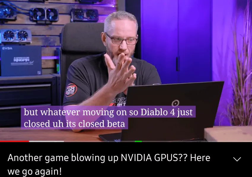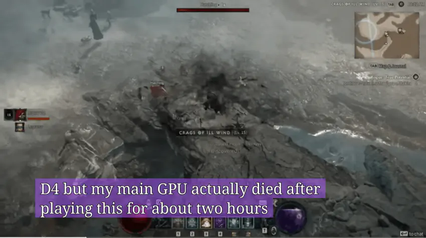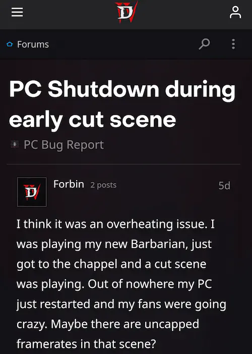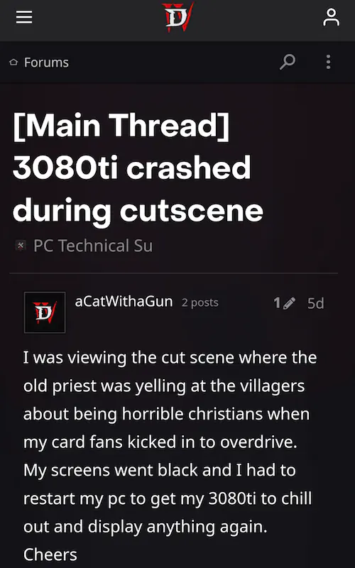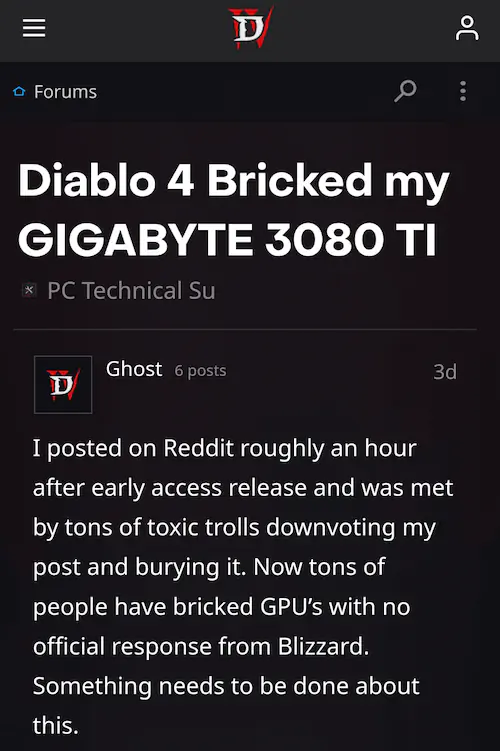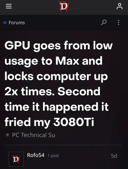 유저가 디아블로 4를 2시간 정도 플레이 하다가 갑자기 디아4를 돌리던 컴퓨터의 그래픽 카드 GPU가 발화되고 그 후 그래픽 카드가 죽었다고 함.