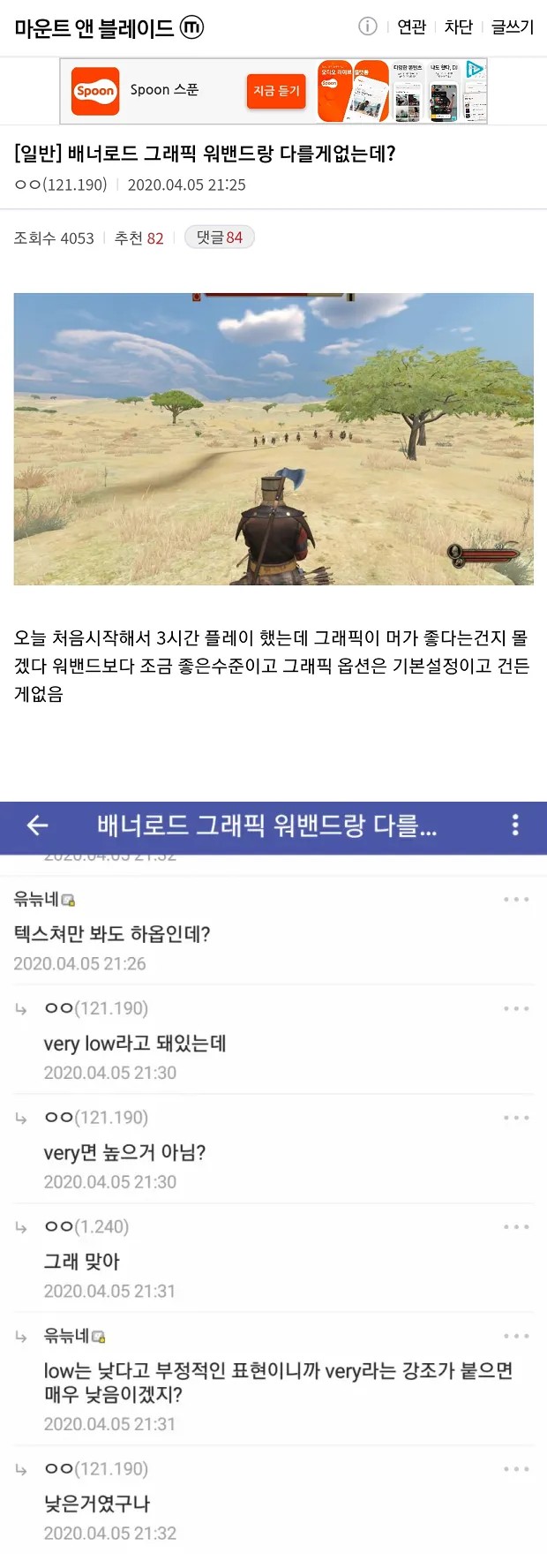 오늘 처음시작해서 3시간 플레이 했는데 그래픽이 머가 좋다는건지 몰겠다 워밴드보다 조금 좋은수준이고 그래픽 옵션은 기본설정이고 건든게없음