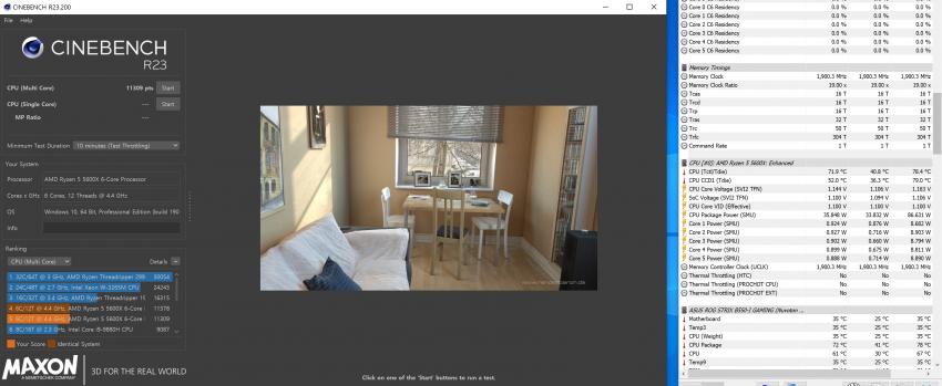 시피유는 5600x, 44배수 1.15v, 시네벤치 r23 10분 테스트함
