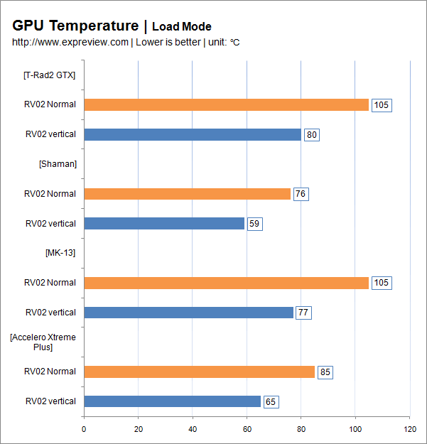위 4종류의 그래픽카드 쿨러는 지면과 수직/수평 방향으로 장착했을때 성능에 상당한 차이가 나고 있습니다. RV02 케이스에 '정상적인 방법'으로 장착했을 때 그래픽카드 쿨러의 히트파이프는 지면과 수직 방향이 되는데 이 경우 성능이 매우 떨어집니다. T-Rad2 GTX와 MK-13은 정상 작동을 완전히 못한다고 봐도 과언이 아니며 GPU 온도가 105도에 진입하여 그래픽카드가 자동으로 보호 모드가 작동하게 되었습니다.