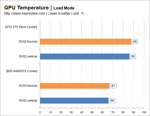 이론적으로 보면 MSI N460GTX HAWK는 지면과 수직으로 장착했을때 히트파이프의 응결 부분이 증발 부분보다 위치가 확실히 낮아지면서, 이때 중력의 영향이 더 커지게 됩니다. 하지만 실제로 GPU 온도는 1도 정도 상승했을 뿐입니다.