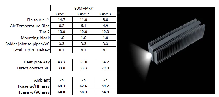 위의 이미지는 이러한 LED 애플리케이션 모델의 요약 페이지입니다. 이 예에서는 두 개의 8mm 히트 파이프를 비슷한 비용의 단일 15mm 폭 증기 챔버와 비교했습니다. 각 '케이스 시나리오'는 서로 다른 길이의 핀 사용을 나타냅니다. 보시다시피 증기 챔버 솔루션은 섭씨 4-5 도의 추가 열 헤드 룸을 제공하지만이 델타는 종종 더 높습니다.