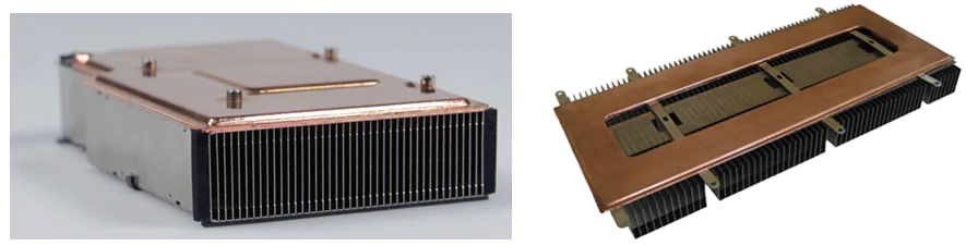 열을 확산시키는 놀라운 작업을 수행하고 로우 프로파일 방열판을 허용하며 사실상 모든 모양으로 만들 수 있고 양각으로 만들 수 있으며 열원과 직접 접촉할 수 있기 때문에 이러한 장치는 다양한 고전력 응용 분야에 사용됩니다. 아래는 두 부분으로 된 증기 챔버를 사용하는 히트 싱크의 두 가지 예입니다.