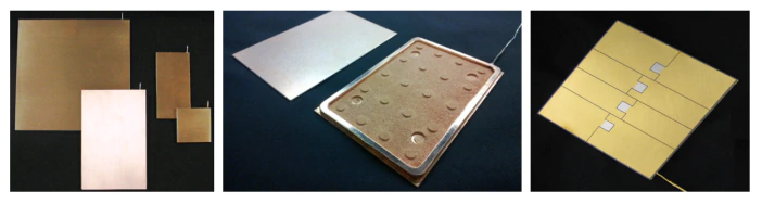 그림 4 (a)는 몇 가지 일반적인 증기 챔버를 보여주고, 그림 4 (b)는 증기 챔버 내부와 면판의 예를 보여줍니다. 그림 4 (c)는 수직 공동 표면 방출 레이저 (VCSEL) 칩을 직접 장착하기 위한 DBC (Direct Bond Copper) 엔벨로프가 있는 증기 챔버를 보여줍니다. (또한 "낮은 CTE, 높은 열 플럭스, 높은 전력, 낮은 저항 증기 챔버 또는 열 접지면"참조 ).