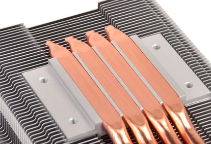 이 문제에 대한 잠재적인 대안은 '직접 접촉'히트 파이프를 구현하는 것일 수 있습니다. 그러나 이 솔루션에는 단점도 있습니다. 아래에서 볼 수 있듯이이 디자인 옵션은 알루미늄 장착 브래킷에 들어있는 약간 평평하고 가공된 히트 파이프를 사용하여 열원과 직접 접촉합니다. 베이스 플레이트와 추가 TIM 층을 제거하여 열 저항을 감소시키면서 증기 챔버 솔루션만큼 효과적으로 열을 확산하지는 않습니다.