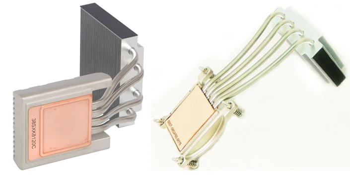 더 큰 총 전력 및 전력 밀도로 인해 결국 열 문제를 해결하기 위해 여러 히트 파이프가 사용되었습니다. 아래의 두 이미지는 모두 소형 폼 팩터의 고성능 데스크톱 PC 용 방열판입니다. 왼쪽에 있는 것은 히트 파이프 애플리케이션 (간접 접촉)에서 일반적으로 사용되는 것처럼 열원과 히트 파이프 사이에 구리 베이스 플레이트를 사용합니다. 이 제품의 후속 세대에서 프로세서 열이 증가함에 따라 회사는 열 문제에 직면했지만 오른쪽 이미지에서 볼 수 있듯이 열 솔루션을 근본적으로 재 설계하고 싶지 않았습니다. 여기에서는 증기 챔버가 구리 베이스 플레이트를 대체하여 열원 전체에 열을 더 고르게 분산시키고 열 파이프로 더 효과적으로 전달합니다. 이것은 두 가지 유형의 2 상 장치를 함께 사용할 수 있는 방법을 보여주는 좋은 예입니다.
