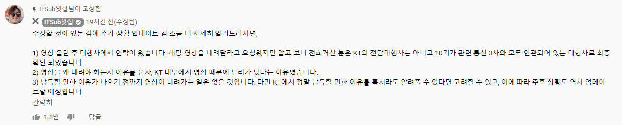 3) 납득할 만한 이유가 나오기 전까지 영상이 내려가는 일은 없을 것입니다. 다만 KT에서 정말 납득할 만한 이유를 혹시라도 알려줄 수 있다면 고려할 수 있고, 이에 따라 추후 상황도 역시 업데이트할 예정입니다.
