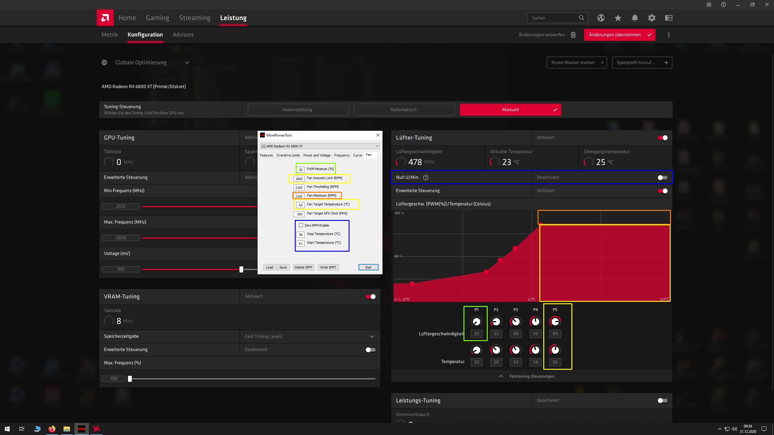 이 값을 사용하면 사전 설정과 관련하여 드라이버에서 AMD의 기본 설정을 변경할 수 있습니다. 악명 높은 "RAGE Mode"는 실제로 +6 % 전력 제한 해제이며 예를 들어 6800은 드라이버에서 비활성화되어 있기 때문에 Rage Mode가 전혀 없습니다. 하지만 여기서 변경할 수 있습니다. 여기에서 이전에 숨겨진 터보 모드를 활성화할 수도 있습니다. 이 설정은 그래픽 카드를 많이 수정하고 싶지 않고 클럭 속도를 기본값으로 유지하려는 사람들에게 유용합니다. 사전 설정을 사용하면 클릭 한 번으로 상대적으로 쉽게 전력 목표와 팬을 수정할 수 있습니다. 노란색으로 표시된 영역에서 원하는 대로 이러한 사전 설정을 조정할 수도 있습니다. 예를 들어 겨울 설정과 여름용 설정, Silent 또는 Max Power를 조절할 수 있습니다.