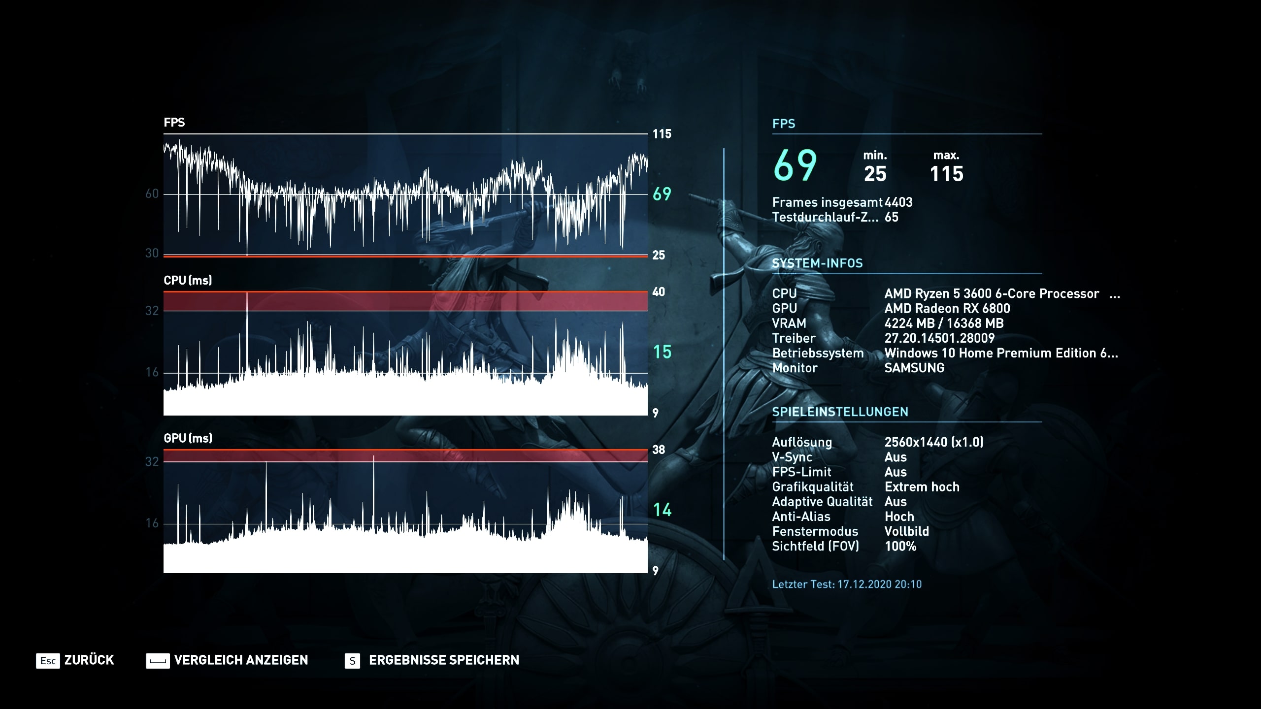내장 벤치 마크와 일반적인 합성 벤치 마크를 사용하여 내 게임 라인업에서 몇 가지 타이틀을 측정했습니다. 그 값은 거의 "단순히"대부분 주식 가치와 일치하기 때문에 상당히 보기 흉하기 때문에 막대 차트를 생략했습니다. 게다가 3600 Ryzen은 이미 QHD를 제한하고 있습니다. 그럼에도 불구하고 결과를 살펴볼 가치가 있습니다. Watch Dogs, SotTR 또는 FH4와 같이 부하가 거의 발생하지 않는 게임은 특히 QHD에서 설정의 이점을 누리며 40 와트 더 적은 전력 소비로 더 많은 성능을 제공합니다.