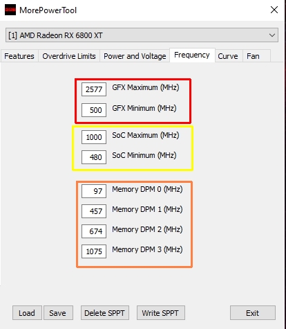 주파수 섹션에서 SOC 클럭 속도를 1200 최대에서 1000 MHz로 약간 낮췄습니다. 이렇게 하면 몇 가지 추가 와트가 절약되어 카드의 전력 제한에 도움이 됩니다. 값을 너무 줄이면 프레임 타임이 너무 늘어져서 실 체감 게임 성능이 떨어질 수 있으므로 잘 모르는 경우 이 값을 그대로 두는 것도 좋습니다. 또한 여기에서 램 클럭을 변경할 수 있습니다. 그러나 나는 이것을 생략하고 Wattman을 통해 램 클럭을 조절했습니다.