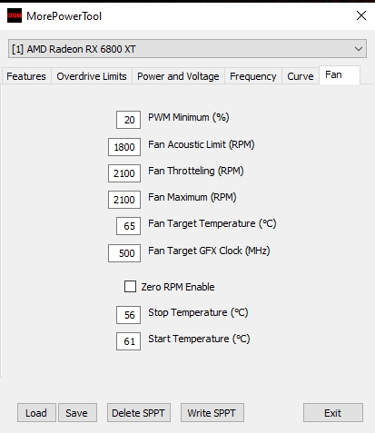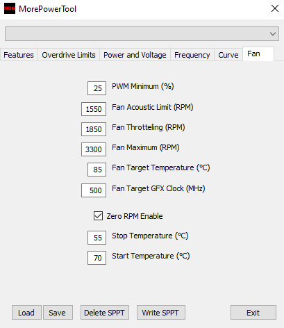 제로 팬에 대한 켜기 / 끄기 및 온도 범위 편집 가능성. 카드가 계속 유휴 상태에서 시작하는 것이 짜증 나나요? 문제없습니다. 온도만 조절하면 상자 안에서 다시 조용해집니다. 와트맨의 경우 팬 스피드를 직접 조절하면 제로 팬이 작동하지 않는데 모어 파워 툴을 쓰면 팬 스피드를 직접 조절하고도 제로 팬 기능을 쓸 수 있게 됩니다.