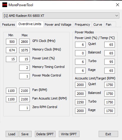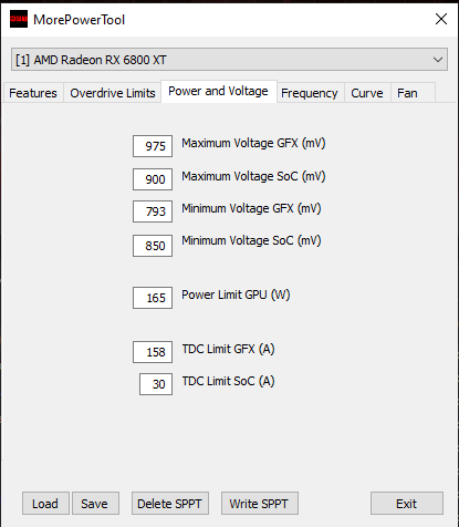 현명한 값은 최대 1075mv입니다. 전압을 낮추면 카드의 저전압에서 넓은 관용도를 얻을 수 있으므로 합리적인 클럭 범위에서 XT를 1075mv로 제한하지 않는 이유가 없습니다. RX 6800은 또한 최대 975mv에서 훌륭하게 실행됩니다. 와트맨의 전압 설정은 효과가 없습니다. 이 설정으로 기본 설정 전압이 아닌 모어 파워툴의 최대 전압 제한에 의해 최대 부스트 클럭의 전압이 제한됩니다. 따라서 훨씬 더 나은 저전압이 가능합니다.