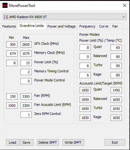 최대 전압 GFX (코어 전압)의 변경은 허용되지 않거나 모델에 따라 제한적으로 만 허용됩니다. 항상 줄일 수 있지만 예를 들어 XT는 1150 또는 1175 이상의 변경을 허용하지 않습니다. 1175 이상은 일반적으로 어떤 카드 든 작동하지 않습니다. 6800은 조건부로 전압 증가를 수용하지만 그렇게 하려면 약간의 트릭을 사용해야 합니다. Wattman에서 미리 설정을 설정하고 프로필로 저장하면 6800에서 전압을 1025 이상으로 설정할 때 발생하는 드라이버 잠금을 우회할 수 있습니다.