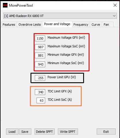 MPT에서 카드의 전력 제한을 늘리면 TDC에도 동일한 비율을 추가하여 그에 따라 변경 사항이 확장되도록 해야 합니다. 전력 제한을 350W로 설정하는 것은 의미가 없지만 TDC 260을 사용합니다 (방금 언급 한 이유 때문에 명시 적으로 설정하지 않는 한). TDC SOC는 실제로 충분해야 하며 가능하면 제한하지 않아야 합니다. SOC를 통해 속도를 늦추는 것은 의미가 없으므로 방해가 되지 않도록 값을 설정하십시오. 내 권장 사항을 따랐다면 언더 볼팅을 실행할 때 전류 제한의 최대치에 근접하지도 않고 잘 실행될 것입니다.