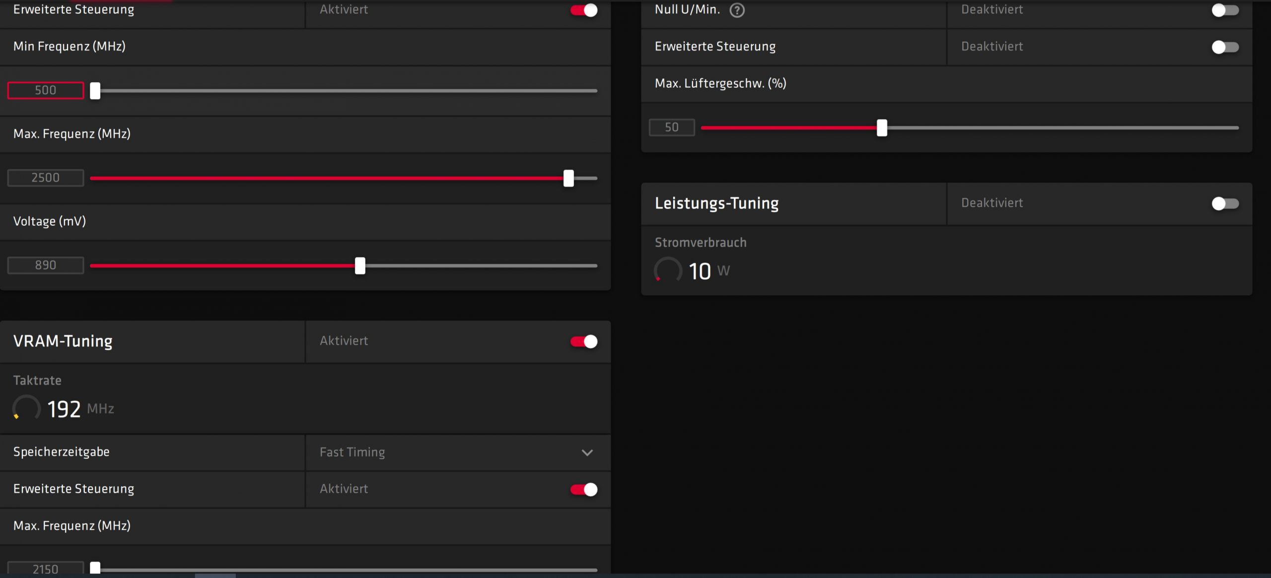 이제 주파수 설정에 도달합니다. 이제 Wattman과 Treiber가 MPT의 반대자로 인정받았기 때문에 조금 까다로워집니다. 그러나 이러한 기능과 설정 중 일부는 잠겨 있지 않고 다른 설정을 저장에 사용할 수 있으므로 잘 알고 있어야 합니다.
