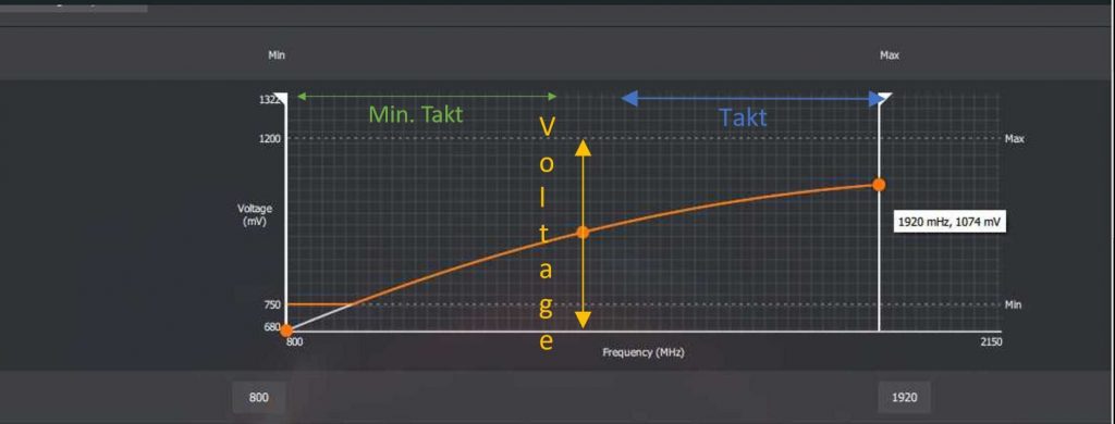 SOC는 메모리 컨트롤러 전압 그리고 gpu코어 이외의 부분의 언코어 작동 전압입니다. 최소 전압을 낮추는 것은 거의 영향을 미치지 않으며 유휴 소비량만 약간 낮아집니다. 그러나 최대 전압 SOC는 매우 흥미 롭습니다. 여기에서 조금 자유롭게 실험하고 값이 불안정해지지 않는 한 현명하게 값을 낮추십시오. 낮은 전압에서 실행할 때 몇 와트의 SOC 소비량을 절약할 수 있으며 해제된 와트는 코어에 직접적으로 도움이 되므로 클럭 속도가 높아집니다. 그리고 이전 버전에도 그랬지만 코어 전압보다 soc 전압 제한이 높으면 코어 전압 또한 더 높게 제한된 soc전압으로 작동됩니다. 그러므로 효과적으로 코어 전압을 내리려면 soc전압의 최댓값을 코어 전압의 최댓값보다 낮게 설정해야 합니다.