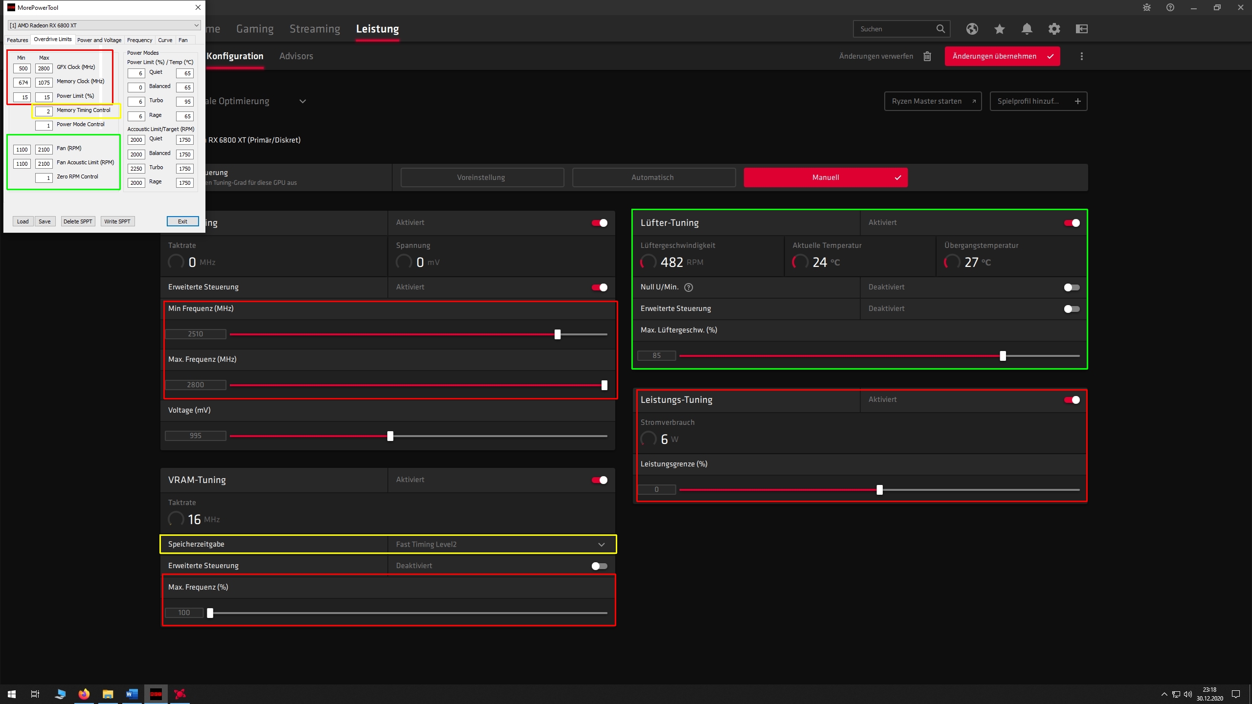 내 설정 / 프로젝트를 설명하기 전에 먼저 MPT의 기능에 대해 자세히 설명하겠습니다. 아직 모호한 부분이 있고 특히 Radeon 초보자는 어려움을 겪기 때문입니다. 또한 이렇게 하면 Radeon RX 6800에 대한 변경 사항을 더 잘 이해할 수 있습니다. 처음 두 명의 라이더는 필수가 아니며 우리 가이드에 실제로 중요하지 않습니다. 그럼에도 불구하고 동일한 이름의 탭에 이러한 기능을 간략하게 입력하고 싶습니다.